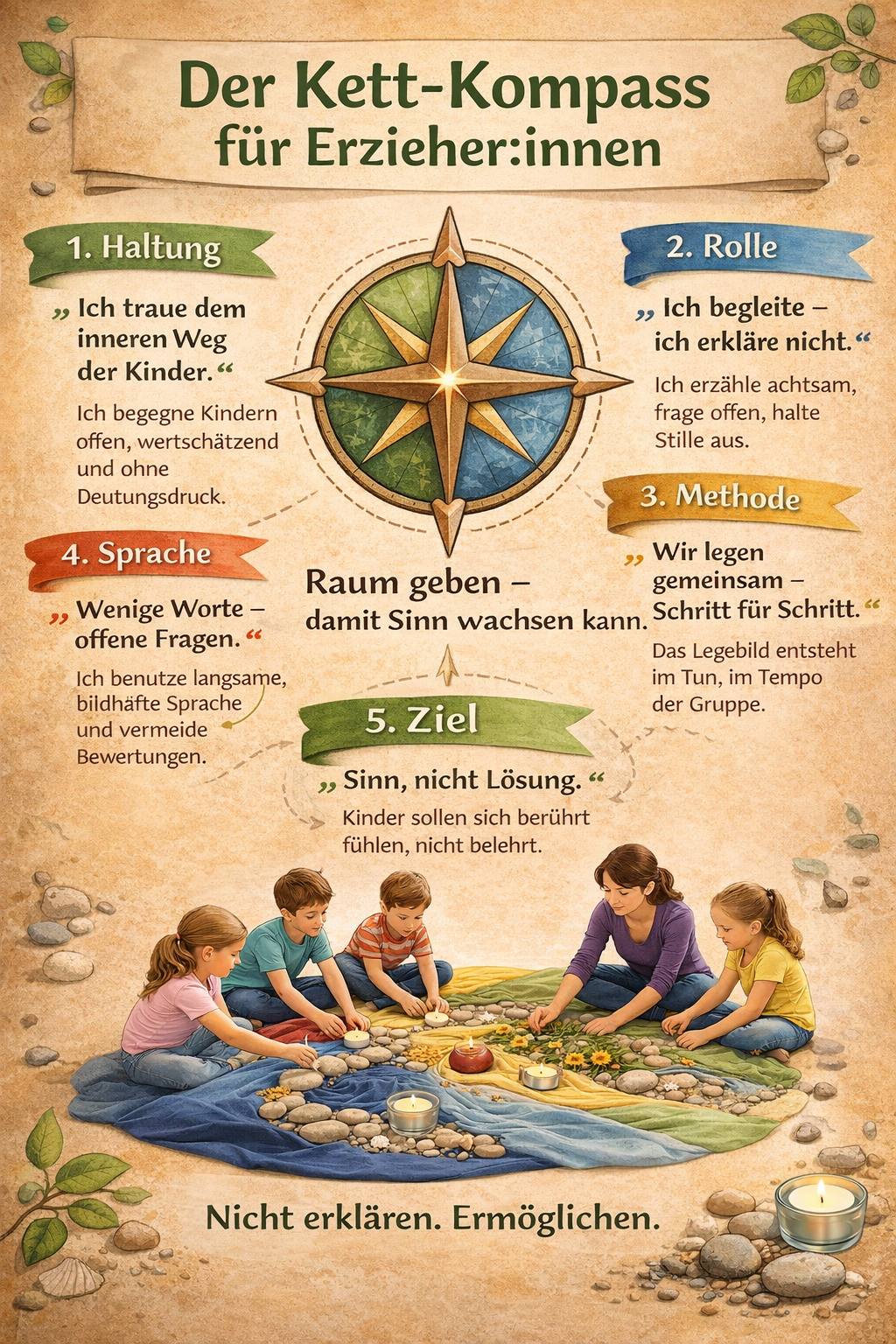 In der Praxis sitzen die Teilnehmenden im Kreis um eine freie Bodenfläche. Mit Tüchern, Figuren, Naturmaterialien oder Alltagsgegenständen wird Schritt für Schritt ein Bodenbild gelegt. Die Leitung gibt dabei Impulse, lässt aber bewusst Raum für Wahrnehmungen, Gefühle und eigene Deutungen der Kinder oder Jugendlichen.